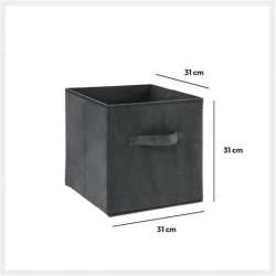 Boîte de rangement 31x31cm Système de rangement personnalisable à combiner avec des étagères modulables. Présentée en sachet à plat. Habillage effet velours. Poignée à l'avant.