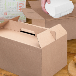 Découvrez notre lot de 100 boîtes de transport de repas en carton ondulé microcanal.