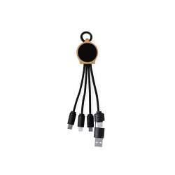 Câble de chargement fabriqué en bambou avec une surface élégante de couleur noire. Il dispose d'une lumière LED intérieure et d'un revêtement extérieur spécialement conçu pour le marquage au laser, illuminant ainsi le logo. Il a des connexions d'entrée USB et USB Type C, et des sorties de Type C, Lightning et Micro USB. Tension de sortie : 5V DC 2.4A. Présenté dans une pochette individuelle au design kraft.