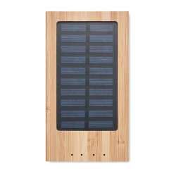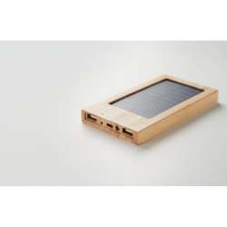 Power bank 4000 mAh en bambou et panneau solaire. Capacité pour l'utilisation d'un smartphone, 2 sorties USB DC5V/1A. Comprend un voyant lumineux et un câble USB avec prise micro usb. Le bambou est un produit naturel, et présente de légères variations de couleur, de décoration et de tailles.