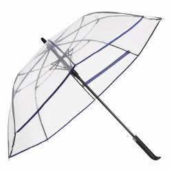 Parapluie automatique VIP: manche en métal, baleines colorés en fibre de verre avec embouts métalliques, embout en plastique, poignée en plastique avec bouton de déverrouillage intégré, couvercle en POE transparent avec passepoil coloré, bride de fermeture avec bouton