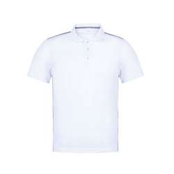 Polo technique pour adulte en polyester respirant 180g/m2. Design bicolore, avec le corps en blanc et les détails en gris. Disponible dans les tailles S, M, L, XL, XXL. Couleur blanche spécialement fabriquée pour l'impression par sublimation.