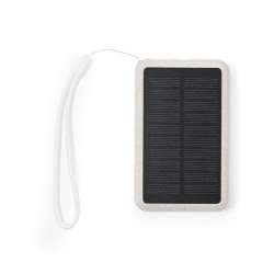 Batterie auxiliaire solaire en fibre de blé. Capacité de 5 000 mAh. Connecteur type C et deux sorties USB. Rechargez facilement en extérieur grâce à son panneau photovoltaïque. Pas besoin de prise. Présentée dans une boîte kraft design.