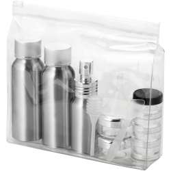 Trousse de toilette approuvée par les compagnies aériennes, pratique et compacte. Elle comprend tout ce qu'il vous faut : deux bouteilles en aluminium de 80 ml, un vaporisateur de 30 ml, deux petits pots, un pot à quatre compartiments, une spatule, un entonnoir et une poire. Idéale pour les voyages, chaque élément est soigneusement emballé dans une pochette plastique. Dimensions : 16 x 17 x 4 cm. Parfaite pour les commandes en gros, cette trousse garantit un excellent rapport qualité-prix pour vos besoins professionnels.