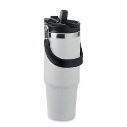 Gobelet à double paroi en acier inoxydable recyclé (90 % d'acier inoxydable recyclé et 10 % d'acier inoxydable) avec couvercle muni d'une paille intérieure, d'un embout pliable et d'une ouverture pour boire directement. Capacité de 850 ml.